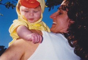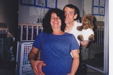 Ilene and I clowning around with diapered teddy bear before the birth, February of 1999