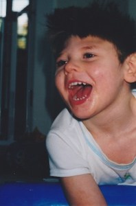 August was lying in the hospital bed wearing a Reese’s Pieces orange T-shirt and a diaper. Arching as ever, he was now batting away again at his noisy Activity Atom and giggling. And then I heard it, his laugh.