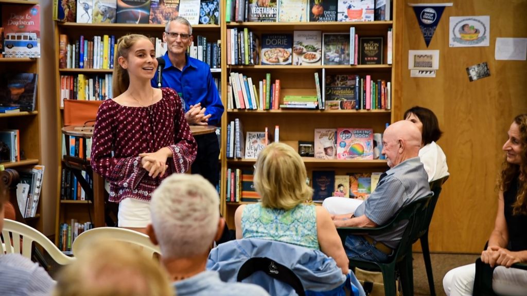 Ilene Chazan speaking at the BookMark about her son, August, August 2, 2019.