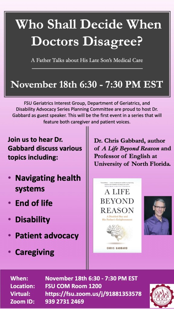 November 18, 2021: Chris Gabbard speaks with the FSU Geriatrics Interest Group. The presentation was sponsored by the Department of Geriatrics and the Disability Advocacy Series, both associated with the Florida State University College of Medicine. See poster below the Youtube link.