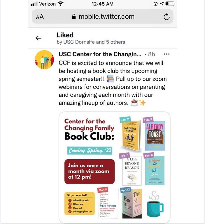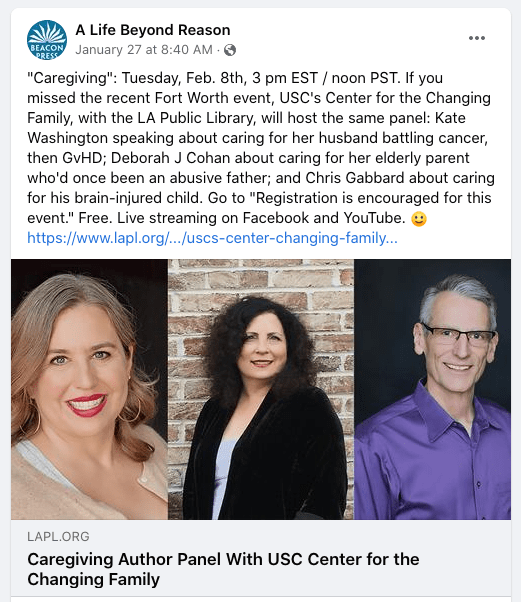 February 8, 2022: The USC Center for the Changing Family Book Club, partnering with the Los Angeles Public Library, presented an online author panel consisting of Chris Gabbard, Deborah J. Cohan, and Kate Washington.